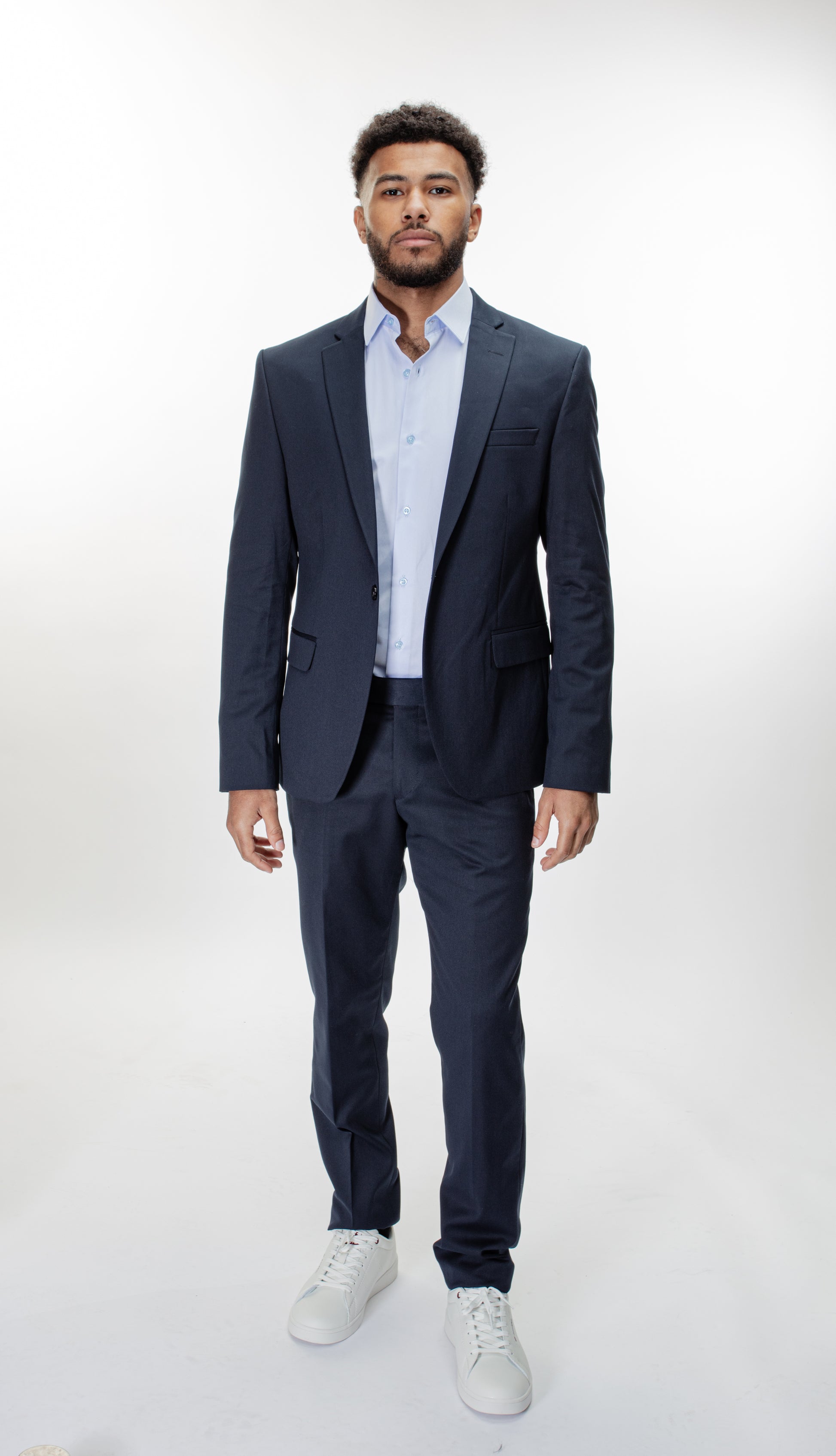 Style décontracté et chic : Sur les photos, le costume est porté avec un t-shirt blanc et des baskets blanches, offrant une touche décontractée tout en conservant un style élégant. La coupe moderne et le tissu extensible permettent une transition facile entre un look formel et un look plus relax, parfait pour les événements moins formels ou les sorties en ville.